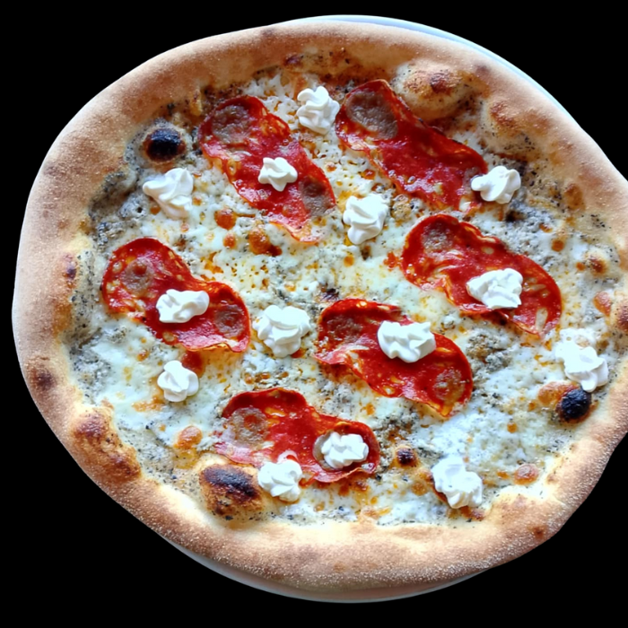 sos śmietanowy, mozarella kulka fior di latte, szynka Cotto, nduja, gorgonzola